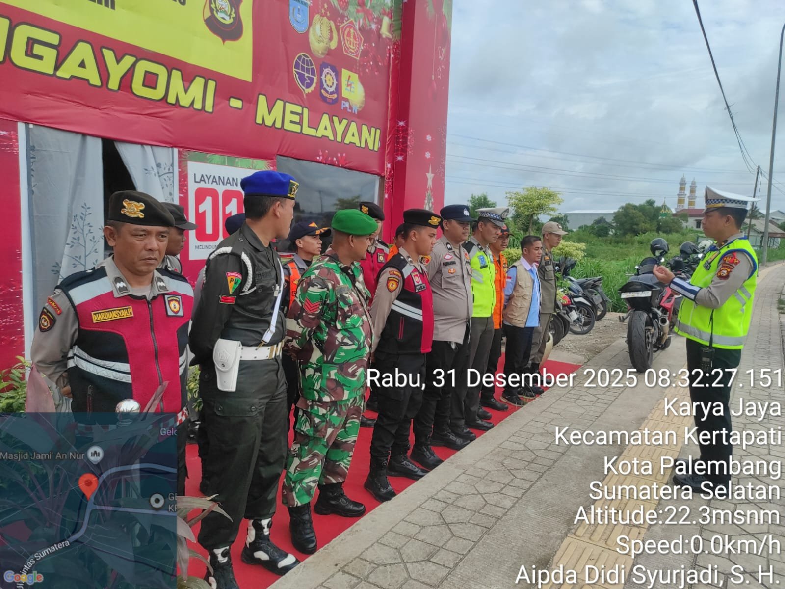 Ogan Ilir-, Dalam rangka pengamanan perayaan Natal Tahun 2025 dan Tahun Baru 2026 pada pelaksanaan Operasi Lilin Musi 2025, Ka Regu B Pos Pam Keramasan, Ipda Gandhi Prianata, S.H., memimpin langsung apel pagi personel pengamanan di Pos Pam Keramasan, Simpang Tol Keramasan, Kecamatan Pemulutan, Kabupaten Ogan Ilir, Rabu (31/12/2025) sekira pukul 08.00 WIB.