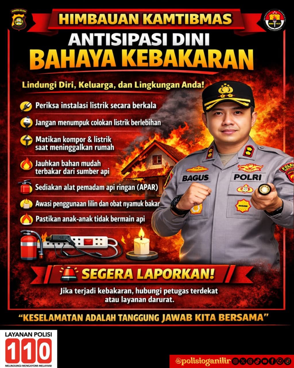 “Pencegahan kebakaran harus dimulai dari hal-hal sederhana. Periksa instalasi listrik secara berkala, hindari penggunaan colokan listrik secara berlebihan, serta pastikan kompor dan peralatan listrik dalam kondisi mati saat meninggalkan rumah,” ujar AKBP Bagus Suryo Wibowo.