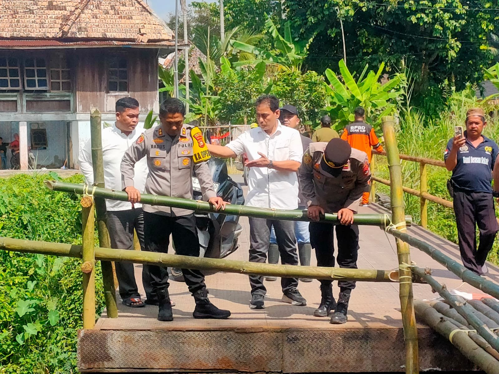 Di lokasi, terlihat sinergi antara masyarakat dan aparat kepolisian yang tengah bergotong royong membangun jembatan darurat dari bambu sebagai akses sementara bagi warga.