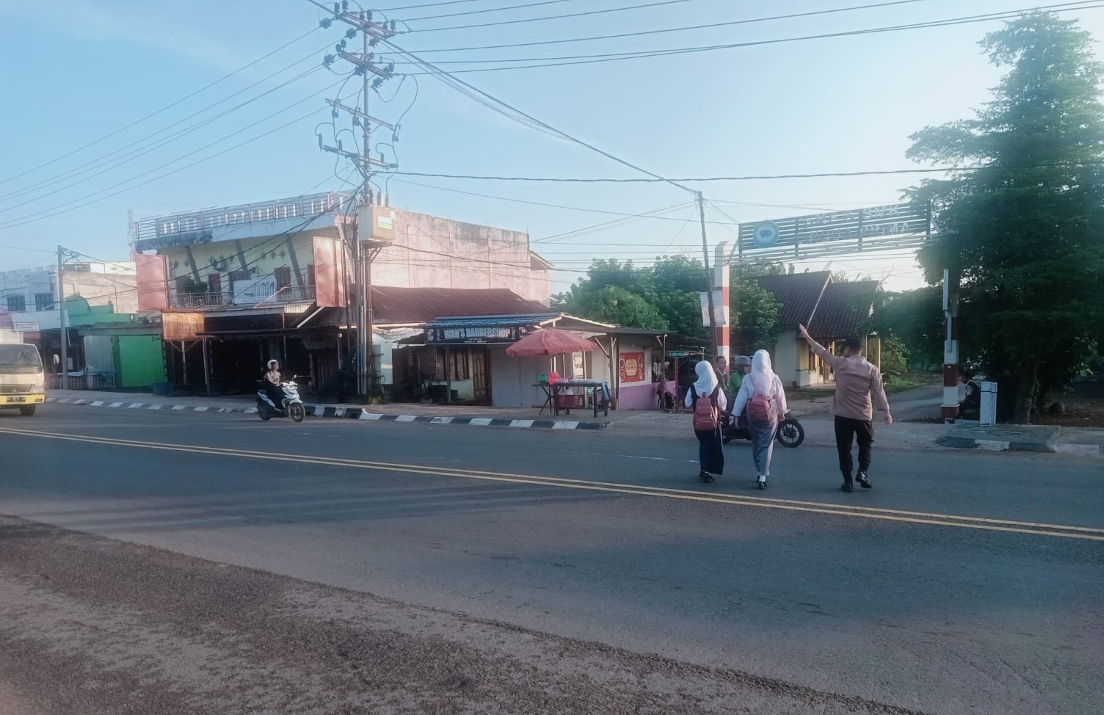 Personel Polsek Indralaya dengan sigap melakukan pengaturan lalu lintas sekaligus membantu para pelajar dan warga menyeberang jalan guna menghindari potensi kecelakaan. Meski arus kendaraan terpantau ramai, situasi lalu lintas secara umum masih dalam keadaan lancar dan terkendali.