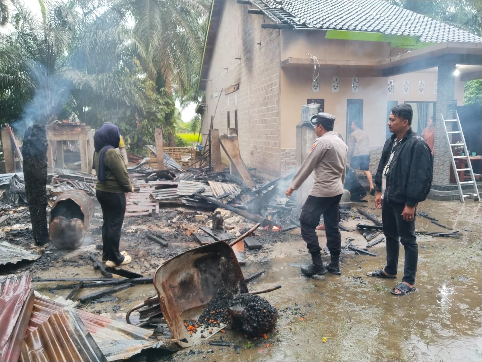 Personel Polsek Tanjung Raja Tindak Lanjuti Peristiwa Kebakaran Rumah Warga di Desa Ketapang II, Kecamatan Rantau Panjang