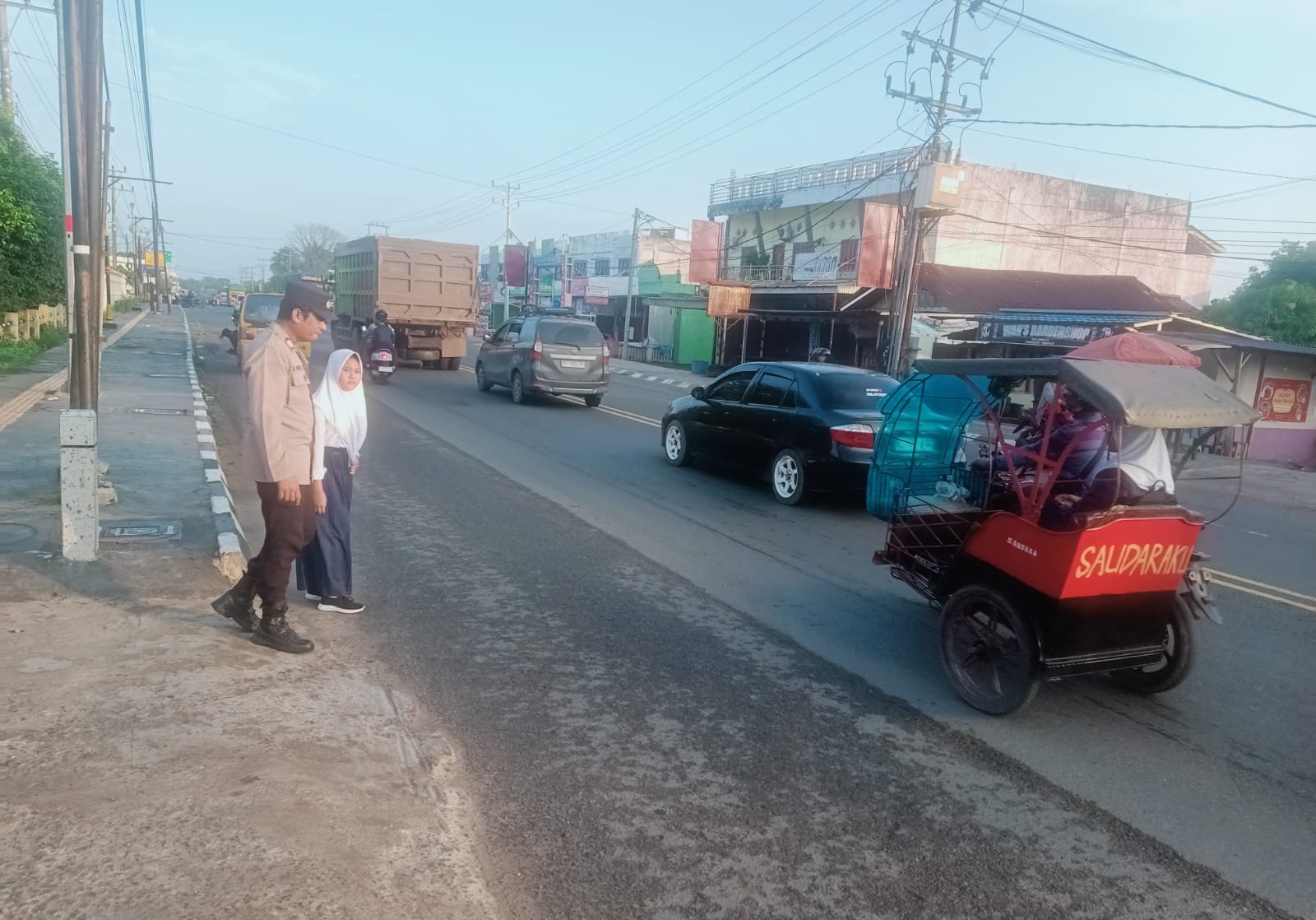 Personel Polsek Indralaya dengan sigap melakukan pengaturan lalu lintas sekaligus membantu para pelajar dan warga menyeberang jalan guna menghindari potensi kecelakaan. Meski arus kendaraan terpantau ramai, situasi lalu lintas secara umum masih dalam keadaan lancar dan terkendali.