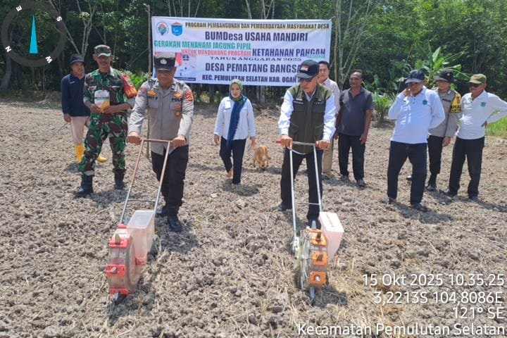 Ogan Ilir-, Dalam rangka mendukung Program Ketahanan Pangan Nasional, Polsek Pemulutan Polres Ogan Ilir bersama Forkopimcam Pemulutan Selatan melaksanakan kegiatan penanaman jagung pipil di Desa Pematang Bangsal, Kecamatan Pemulutan Selatan, Kabupaten Ogan Ilir, pada Rabu (15/10/2025).