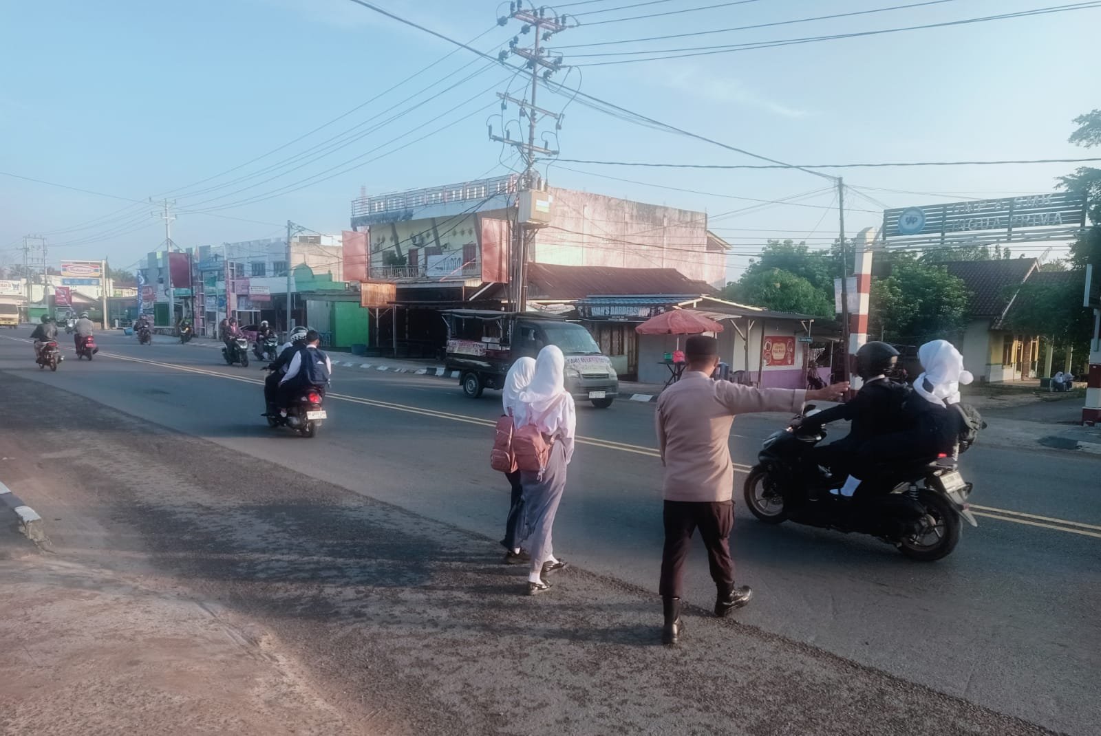 Strong Point Pagi Hari, Personel Polsek Indralaya Sigap Atur Lalin dan Bantu Pelajar Menyeberang di Simpang Sekolah